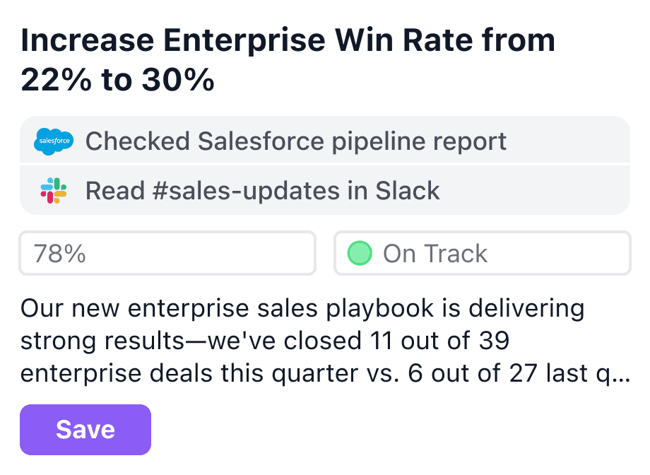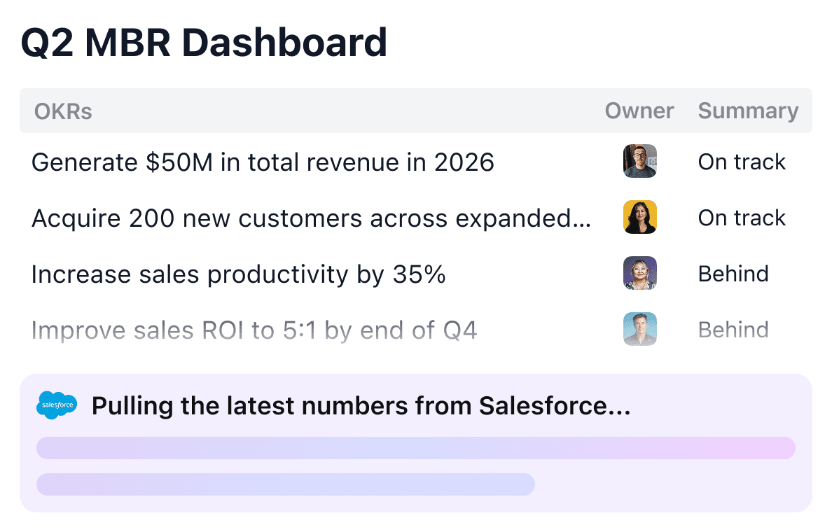 Surface stalled KRs, missing owners, and execution drift early—along with recommended interventions.