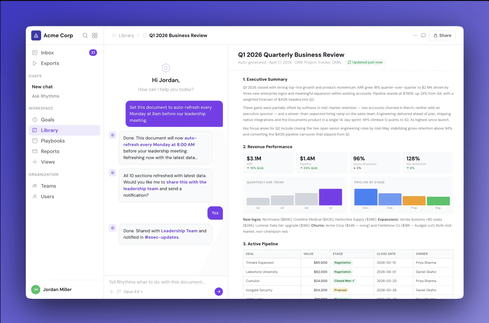 Today we're shipping Documents — a new way to build business reviews, QBRs, team syncs, and operational reports inside Rhythms.