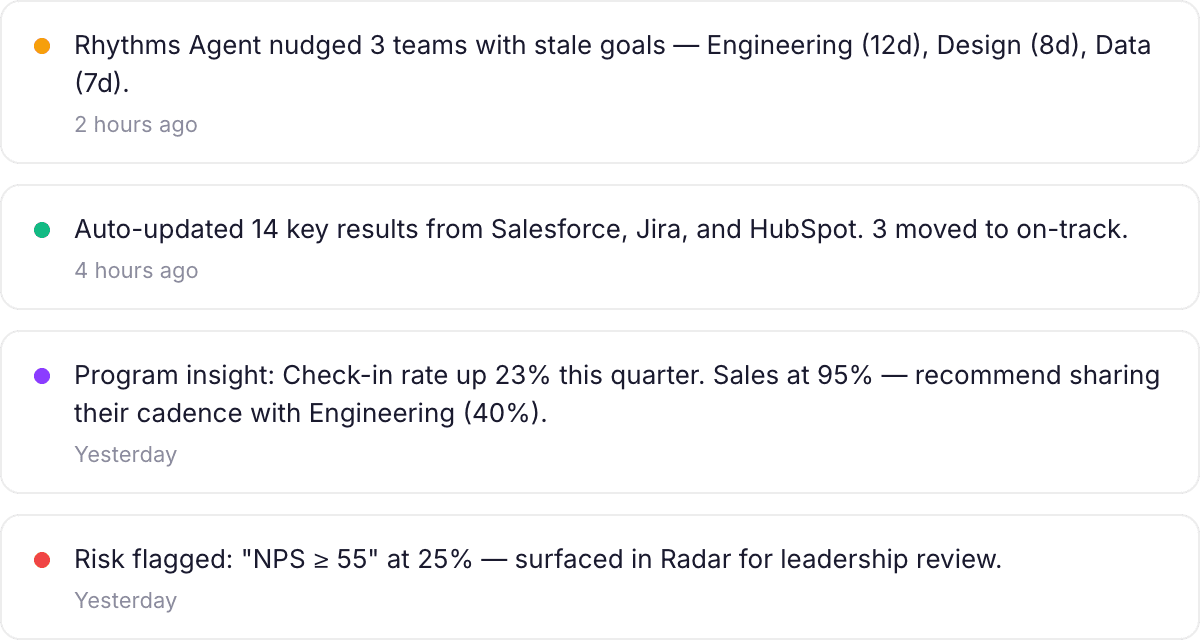 Rhythms' agent nudges stale owners with context (not generic reminders), tracks adoption by team, and surfaces where the process is breaking down.