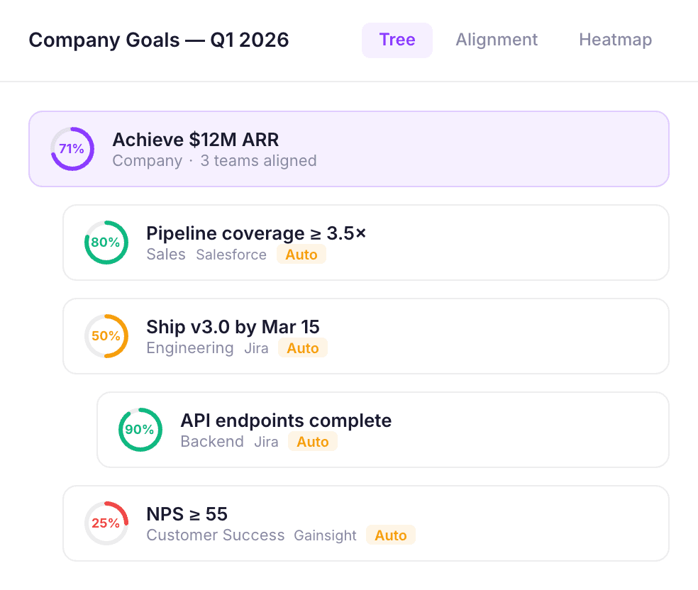 Visualize how company OKRs cascade to every team. Spot alignment gaps and dependency risks before they become problems.