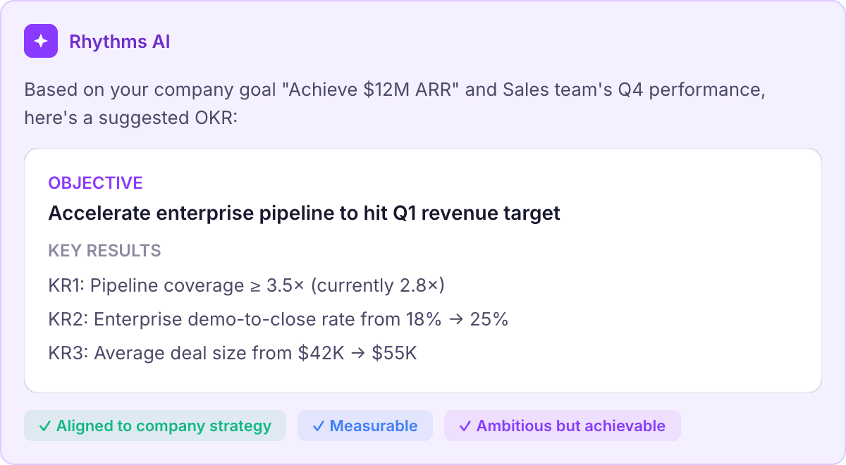 Rhythms sees your company strategy, peer team objectives, and last quarter's performance — then drafts measurable, aligned OKRs grounded in your reality.